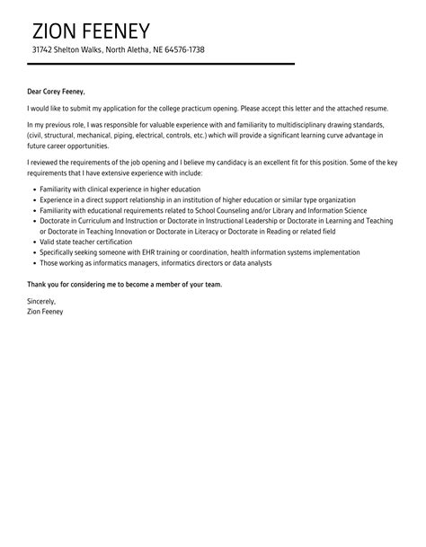 Sample Cover Letter For Practicum . Looking for cover letters on practicum and ideas? Learning how to write an effective cover letter for an internship can help you highlight your skills and other valuable assets to a company.